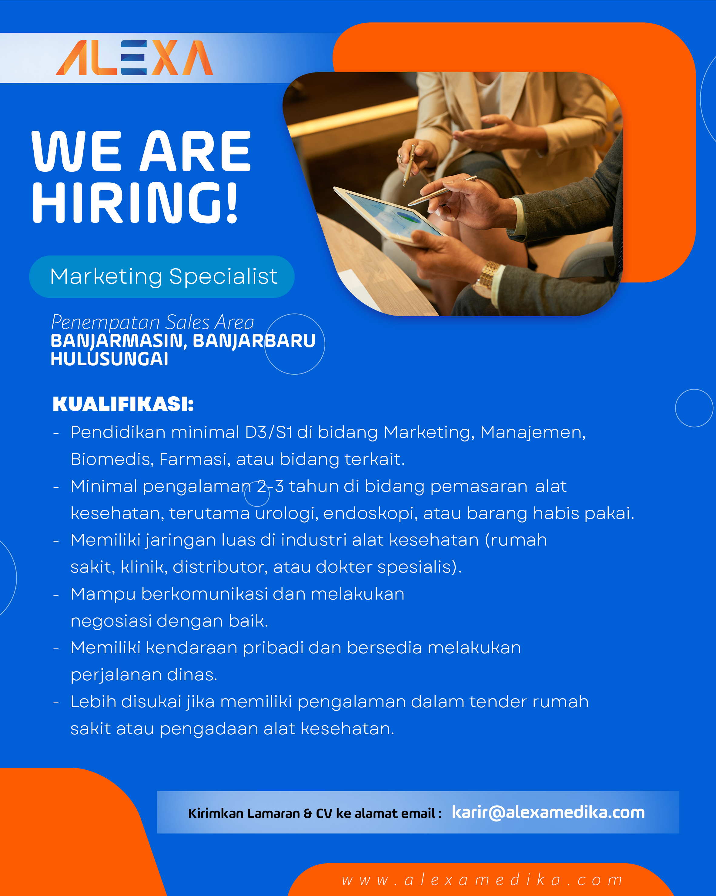 - Lebih disukai jika memiliki pengalaman dalam tender rumah sakit atau pengadaan alat kesehatan.